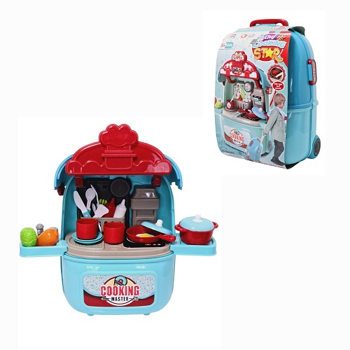 - Dětská kuchyňka v kufříku 2v1 se světlem a zvukem – modrý interaktivní herní set na kolečkách, 26 doplňků