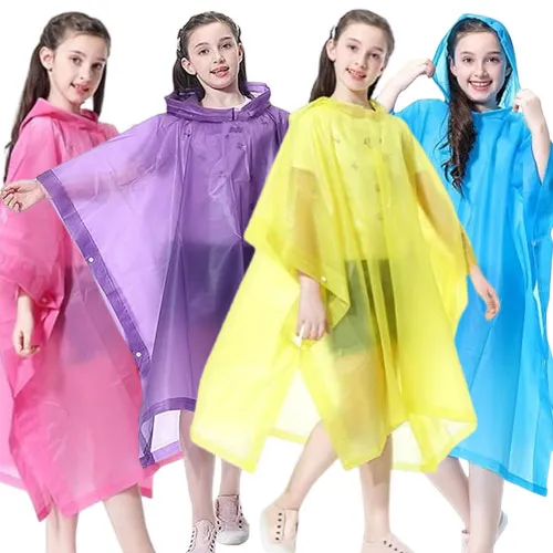 Nepromokavé dětské pončo pro výšku 120–160 cm. Lehký materiál EVA, zapínání na druky a kapuce se šňůrkou. Volný střih ideální i přes batoh. celý popis